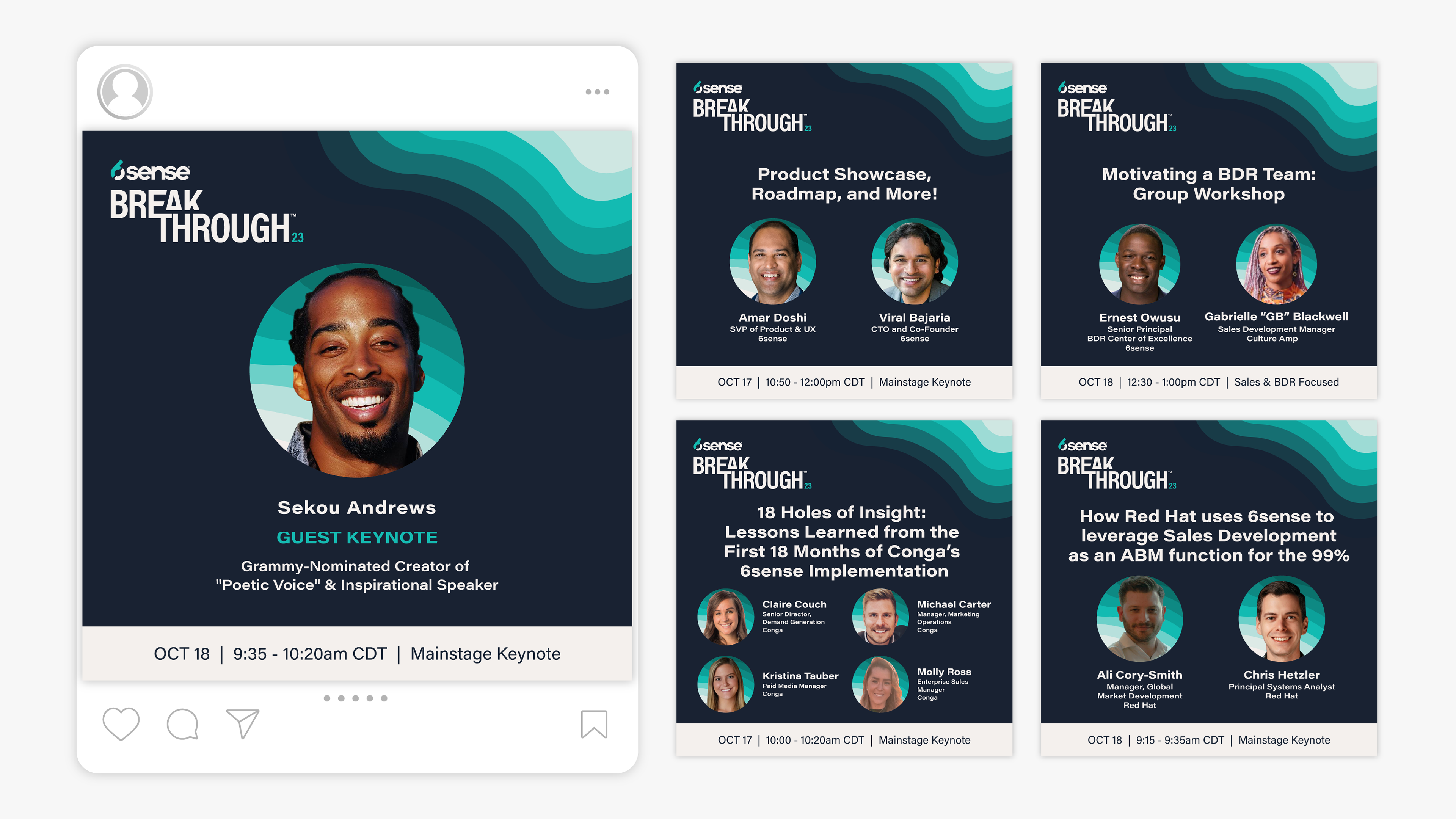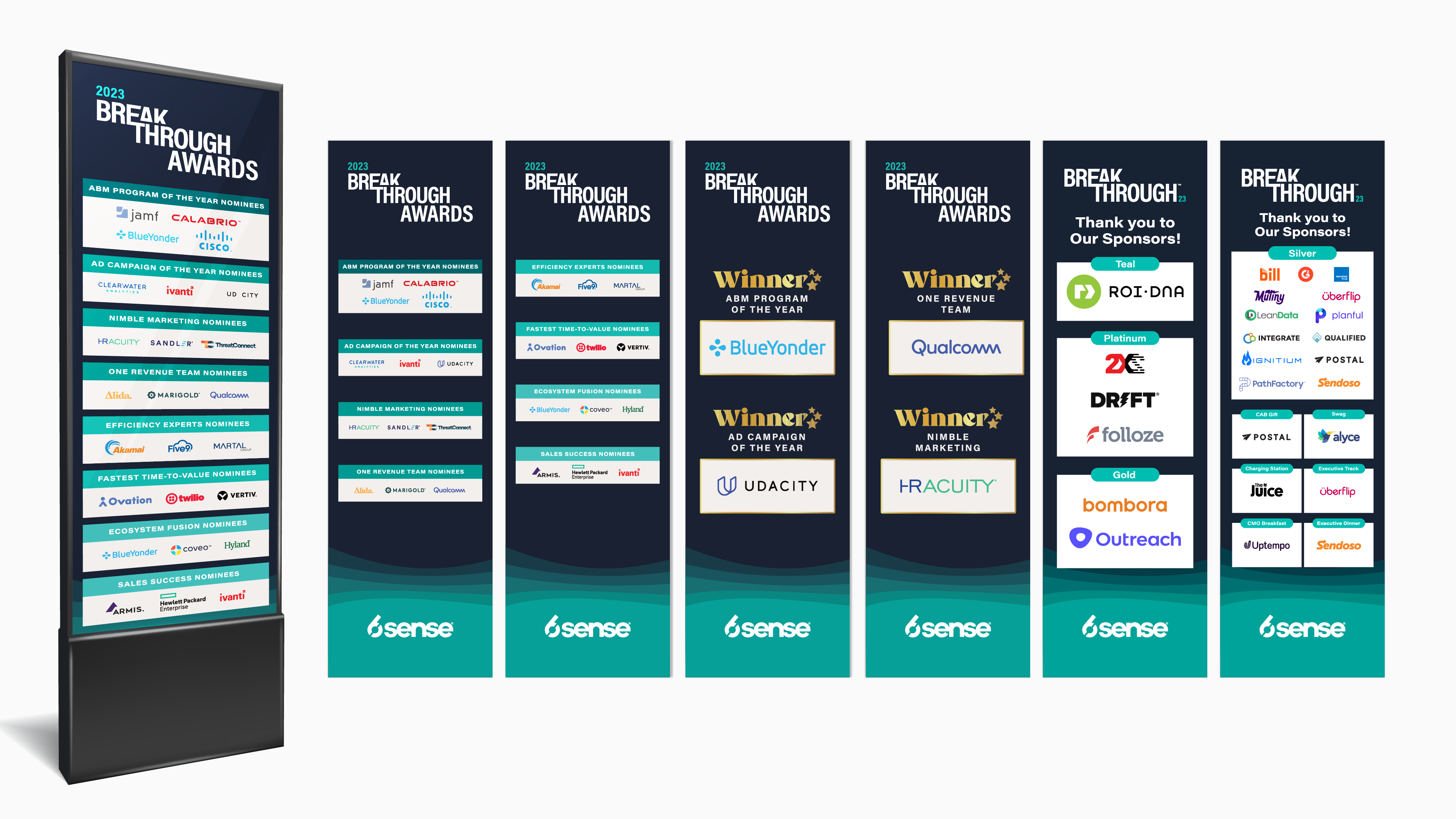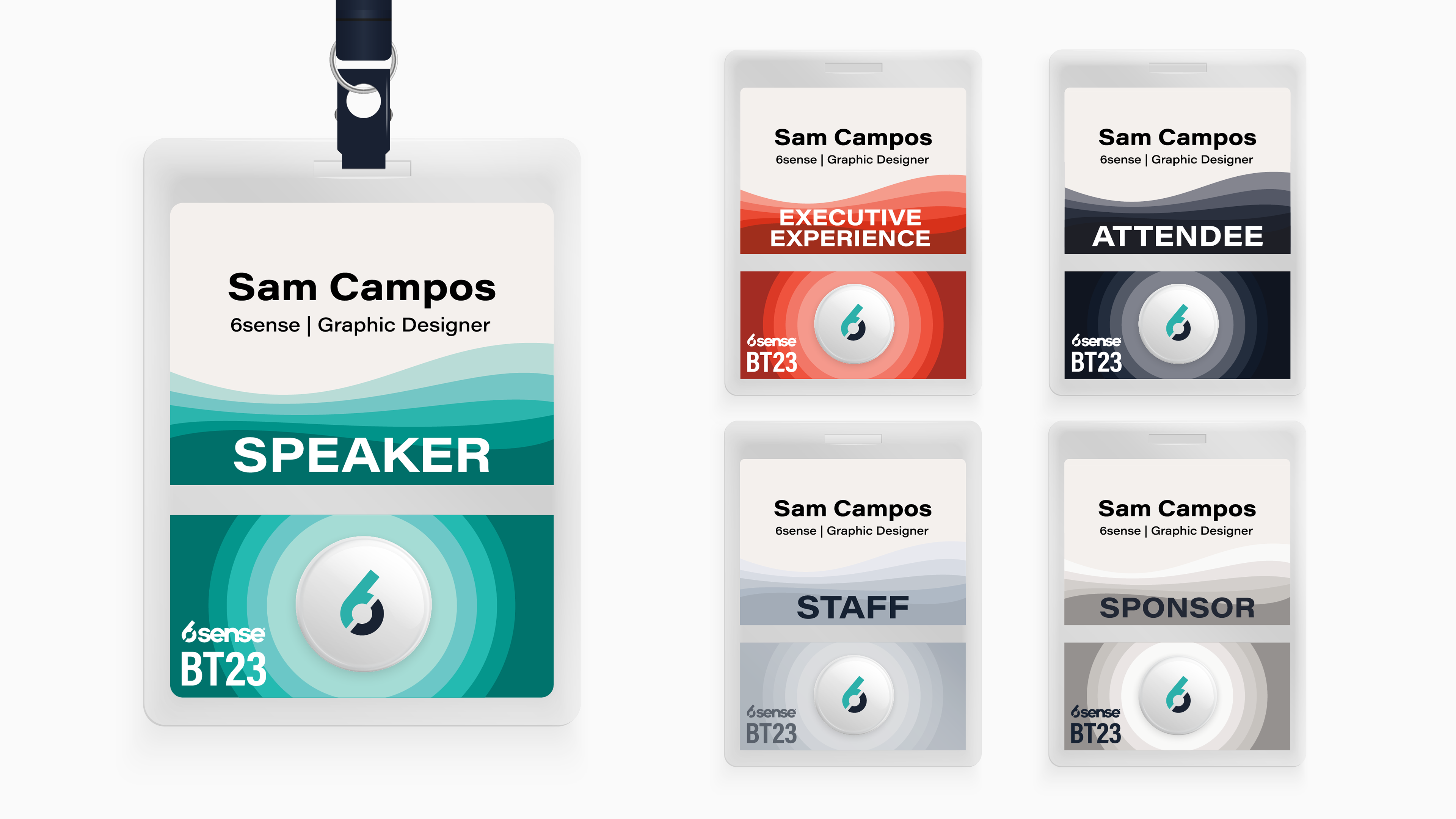 I supported the Creative Director and Art Director on Breakthrough 2023, 6sense’s flagship annual event with over 1,200 attendees. I contributed to developing the event branding and designed a wide range of promotional assets, including general event and sponsor promotions for more than 60 guest speaker sessions. I created the Executive Experience logo and the “BE MORE” graphic, designed the speaker presentation template used across 50+ sessions, and developed digital venue signage, iPosters, meter boards, and agenda monitors. I also collaborated with the Customer Marketing team to produce visuals for the Breakthrough Awards ceremony. In addition, I designed the event lanyard and a set of over 30 collectible pin buttons used by attendees to personalize their badges.